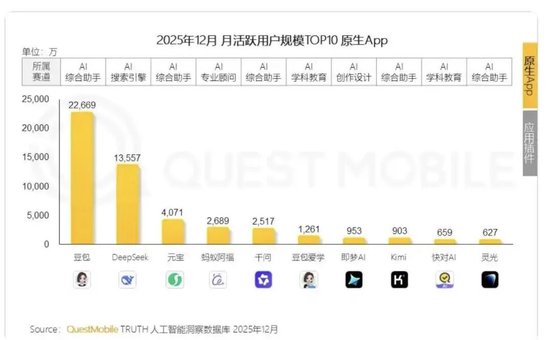 3月3日,Quest Mobile发布《2025年AI应用层发展核心报告》,勾勒出国内AI应用的竞争格局。截至2025年12月,AI原生App月活用户前五名为豆包、DeepSeek、元宝、蚂蚁阿福、阿里千问。旗下AI助手灵光也跻身前十。