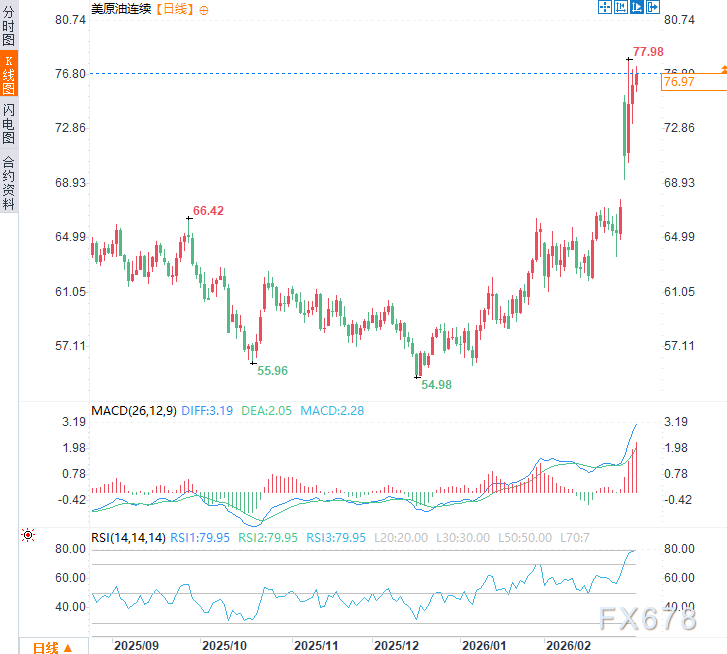 周四(3月5日)亚市时段,美原油价格震荡上行,现交投于每桶77.10美元附近,日内涨幅约3.2%,延续了此前两个交易日涨势。若霍尔木兹海峡长期关闭,美银等机构警告油价可能突破100美元/桶,欧洲天然气价格或飙升至70美元/兆瓦时以上。
